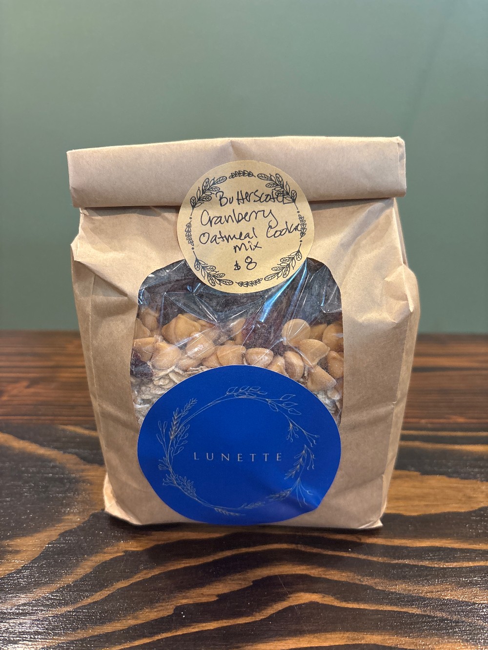 Butterscotch Cranberry Oatmeal - All Purpose Flour, Oatmeal, Butterscotch chips, Dried Cranberries, Brown Sugar, Sugar, Baking Soda, Baking Powder, Cinnamon, Nutmeg, Ginger, Salt