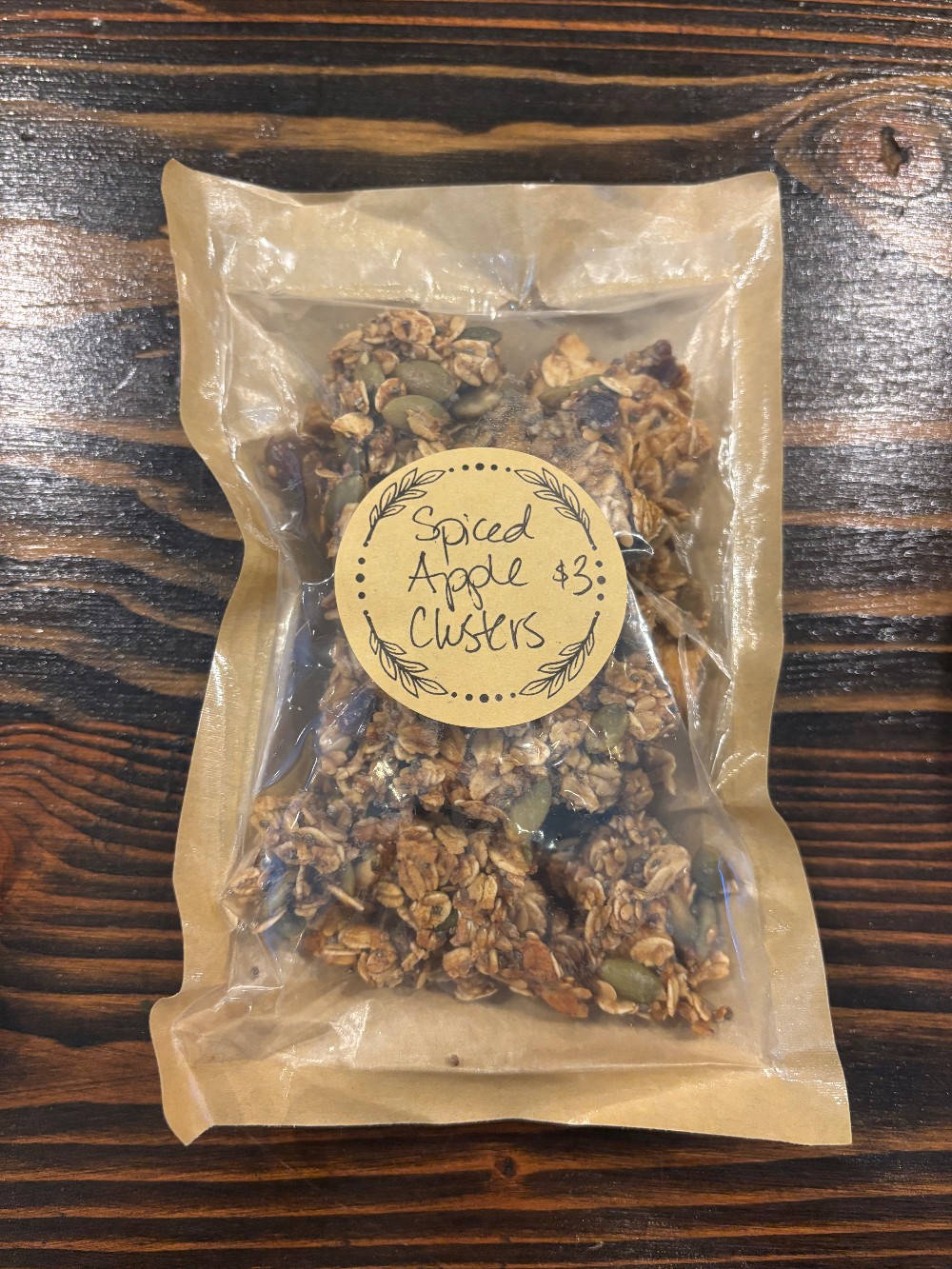 Spiced Apple Clusters - Oats, Dried Apple, Pumpkin Seeds, Dates, Egg White, Maple Syrup, Flax Seed, Chia Seed, Cinnamon, Ginger, Vanilla, Salt